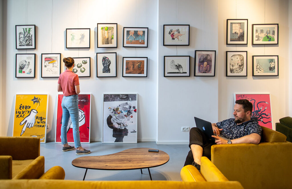 Sztuka na Miejscu to przestrzeń, w której sztuka jest na wyciągnięcie ręki – jej nienachalna obecność pozwala na oswojenie się ze światem artystycznym w nieformalnym otoczeniu. To miejsce zachęca do pozostania na dłużej, rozgoszczenia się wygodnie na kanapie, napicia kawy lub wina, a wszystko to w inspirującym otoczeniu Sztuki.