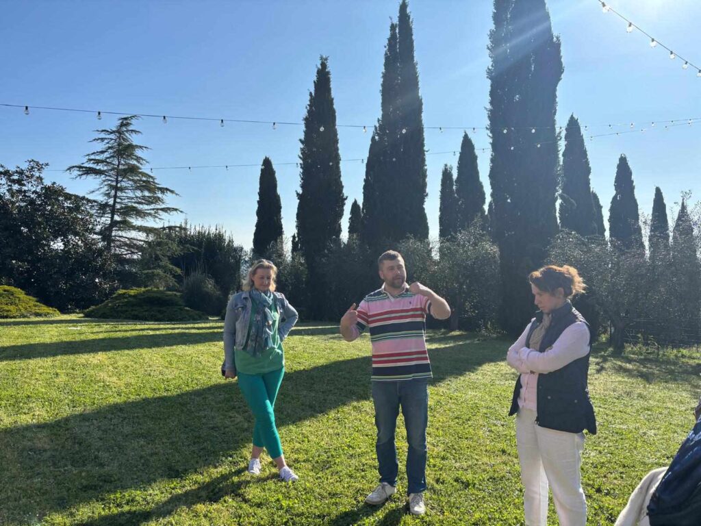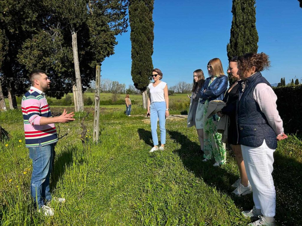 Jednym z najbardziej wyjątkowych momentów naszego wyjazdu do Toskanii była wizyta w malowniczej winnicy Toscanizzazione, położonej pośród łagodnych wzgórz otulonych winoroślą. Gospodarzem spotkania był charyzmatyczny Ariel, który z pasją i ogromną wiedzą oprowadził nas po całej posiadłości. Miałyśmy okazję zajrzeć za kulisy winiarskiej codzienności, przejść się między rzędami winorośli i zobaczyć, jak wiele pracy i serca wkłada się w każdą butelkę. Ariel dzielił się z nami nie tylko faktami, ale i osobistymi historiami – o tym, jak powstała Toscanizzazione, jak łączy się nowoczesność z tradycją i jak wino może być odzwierciedleniem charakteru regionu.